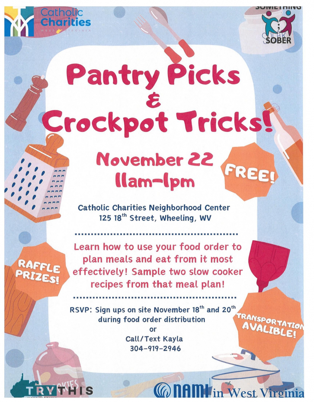 - Prepare two slow cooker recipes featured in that plan created from a food order provided by Catholic Charities Neighborhood Center.