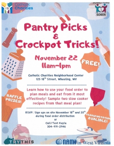 Participants can sign up on-site during food distribution at Catholic Charities Neighborhood Center on November 18th and 20th or by calling/texting Kayla at 304-919-2946.
